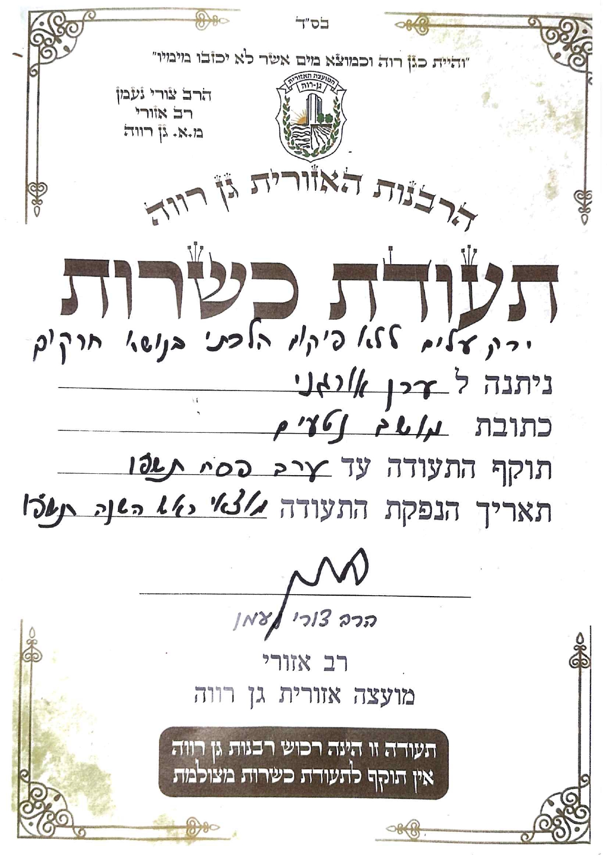 תעודת כשרות שנת תשפ"ו